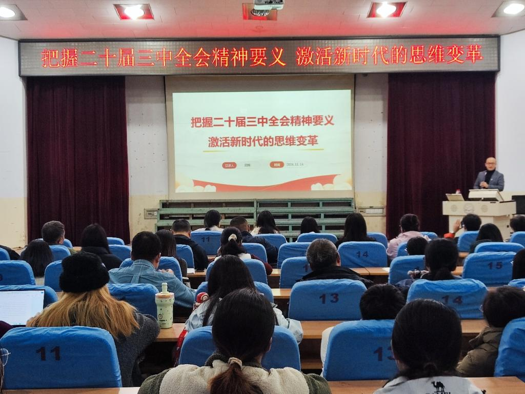 宣讲会上,田辉教授以《把握二十届三中全会精神要义,激活新时代的思维变革》为题,从十一届三中全会召开以来,历次三中全会改革内容不断变化的纵向经度和《决定》主要内容三大板块的横向维度,全方位、深层次对党的二十届三中全会进行了系统宣讲和深入阐释,又结合对马克思主义的世界观和方法论中事物两次创造、河流落差流动、源头活水、逆商思维、行动思维等基层实践的理解认识,深刻阐释了把握党的二十届三中全会精神核心要义,激活新时代的思维变革的重要作用,为全体与会人员认识和把握全会精神的内涵要义提供了遵循。